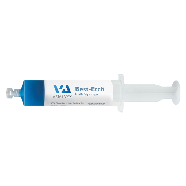 Best-Etch is a 37% Phosphoric Acid Etch, designed to etch and prepare dentin and enamel. It is a viscous solution that stays in place and rinses clean with water, ensuring no residue. Pre-bent applicator tips ensure precise delivery.