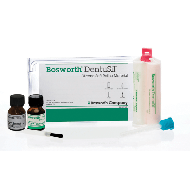 One-visit, cartridge-dispensed silicone, soft reline material. Material is durable and will maintain effectiveness in the presence of moisture. Adhesive is specially formulated to hold material in place providing a secure, comfortable reline in just minut