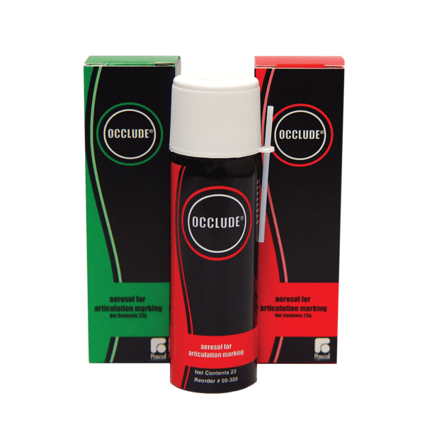 Occlude is an aerosol spray used for articulation marking. This indicator spray is an excellent aid in seating castings and marks any tooth or restorative surface (including gold), in either a wet or dry field.