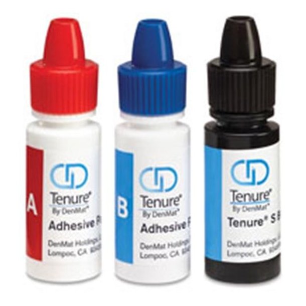 Tenure is a two part system using Part A and Part B multipurpose, self-cure adhesive bonds to enamel, dentin, porcelain, composite and metal. Indicated for bonding all routine direct and indirect resin composites, porcelain, ceramic veneers, amalgams, precious and semi-precious metals, indirect gold, porcelain, and ceramic inlays and onlays, and crown prep desensitization prior to impression/temp.